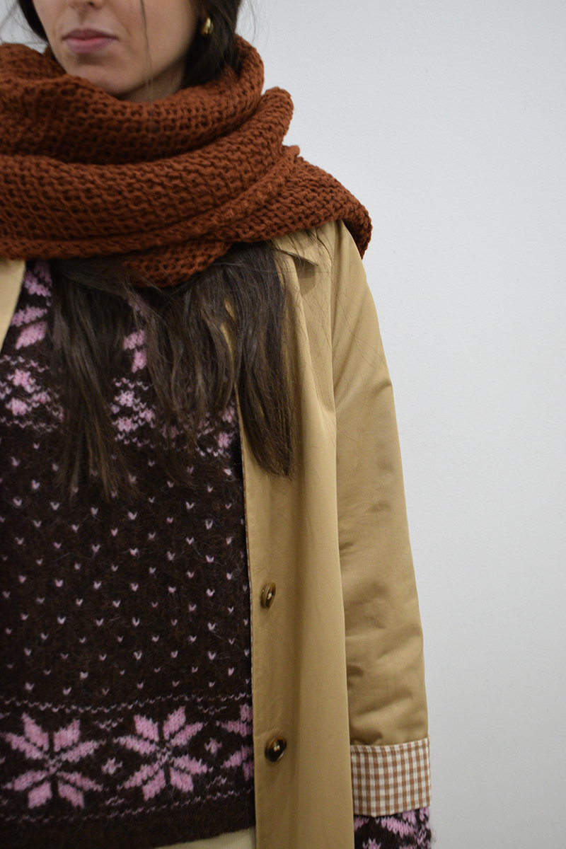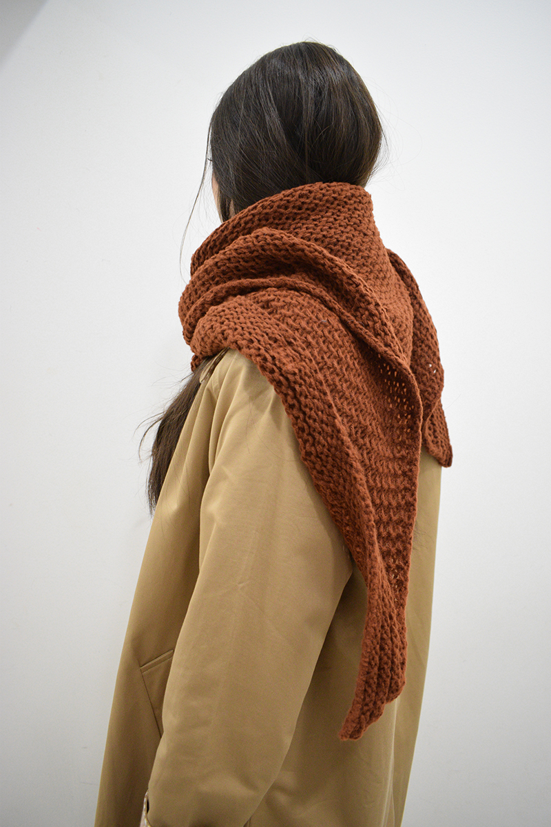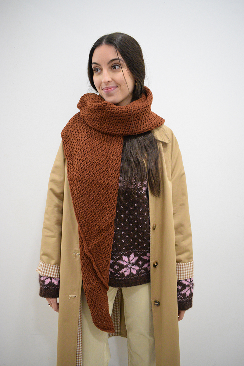 Toquilla calada marrón Amona con una hevilla para sostenerla.